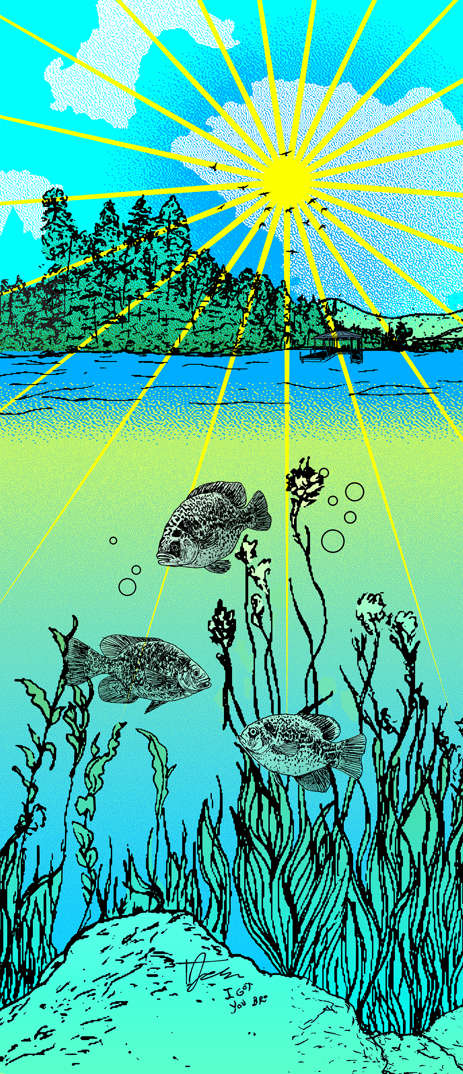 Tucker had been located in Minnesota as was the the lake on which he spent time wakeboarding. A crappie is a commonly found fish in Minnesotan lakes which is why I chose them to represent the wildlife throughout the water and sun. The addition of Tucker’s signature and his tag, “I got you bro,” were added as easter eggs into the illustration.